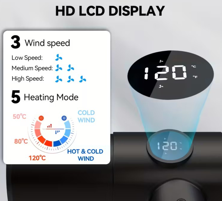 Controlla in tempo reale temperatura e velocità dell’aria grazie al display digitale chiaro e moderno. Massima precisione, zero sorprese.