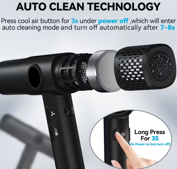 Sistema di auto-pulizia automatica: basta tenere premuto il pulsante dell’aria fredda per 3 secondi a phon spento. Il dispositivo si pulisce da solo e si spegne automaticamente. Più igiene, più durata nel tempo.