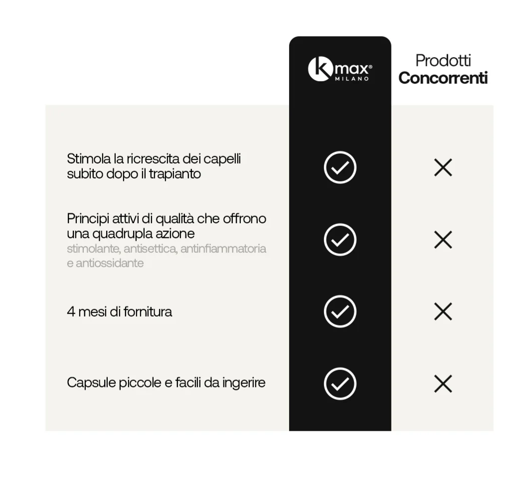 Kmax Integratore post trapianto dei capelli è un integratore alimentare che offre un'azione stimolante, antisettica, antinfiammatoria e antiossidante per velocizzare la ricrescita dei capelli post trapianto