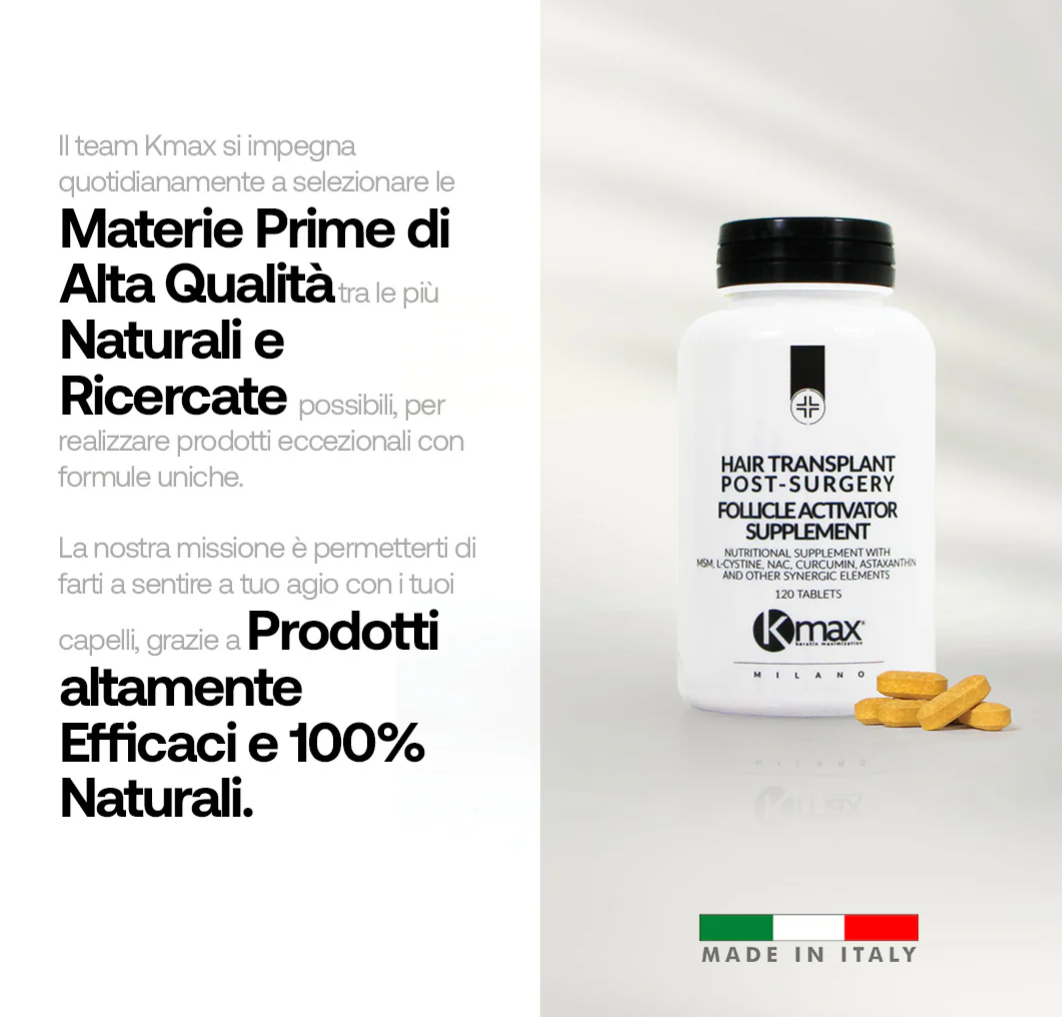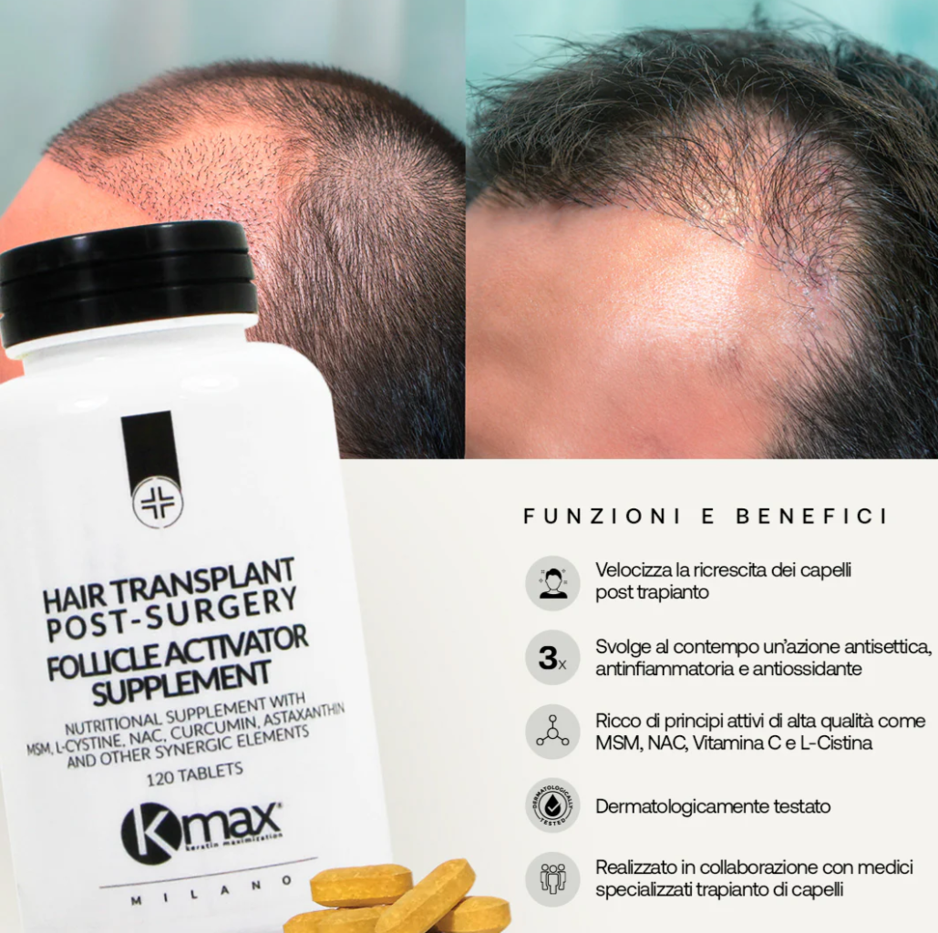 Kmax Integratore post trapianto dei capelli è un Integratore multicomponente a base di MSM, L-Cistina, NAC, Curcuma, Vitamina C, Vitamina E, Astaxantina e Biotina.